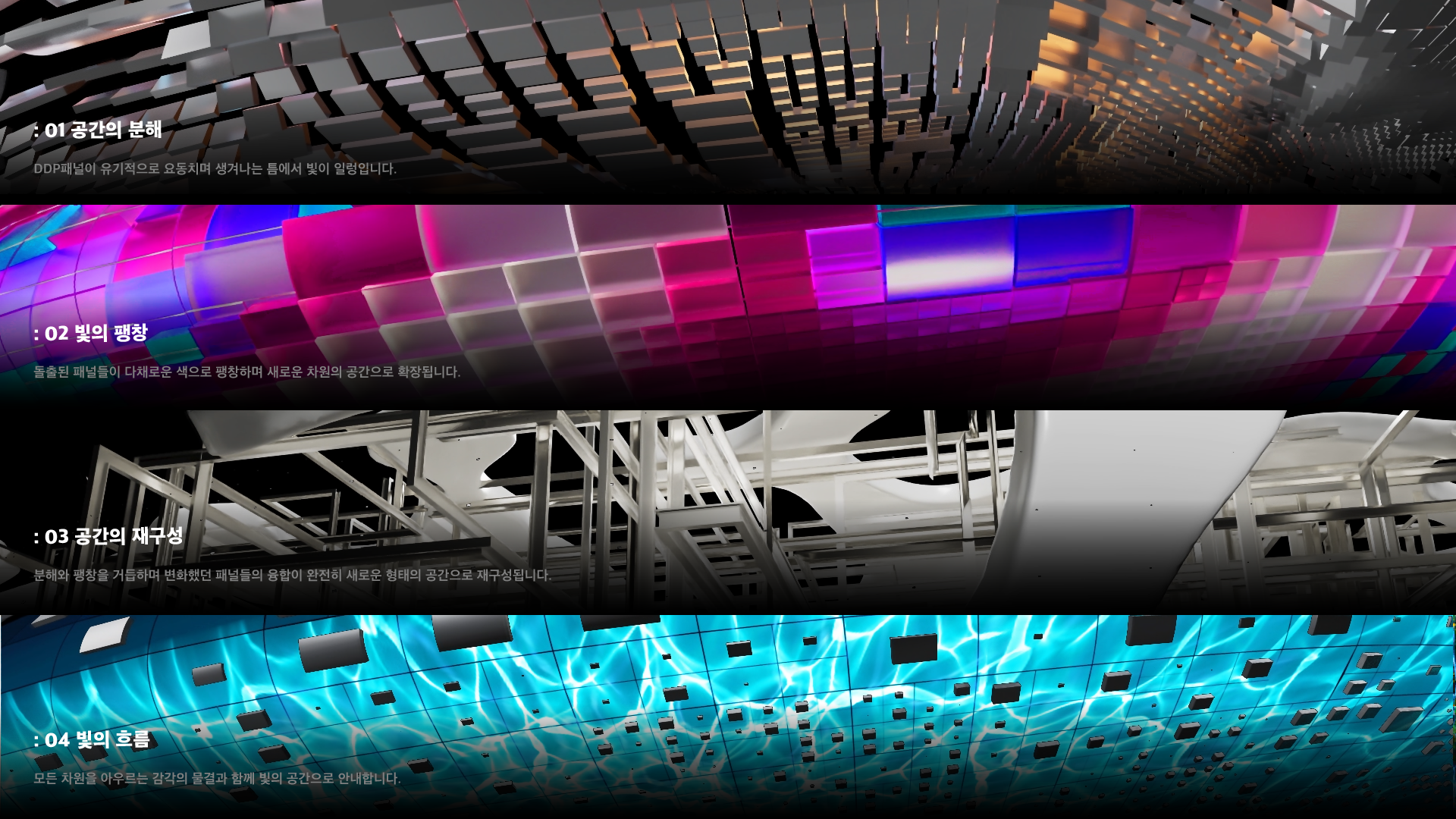 유려한 빛의 흐름이 관객을 부드럽게 감싸며, 일상의 공간을 넘어 현실과 상상이 교차하는 경계로 안내합니다.