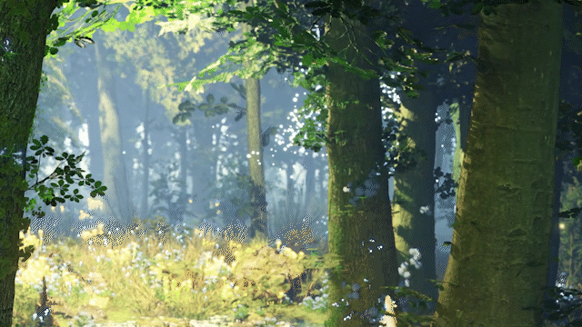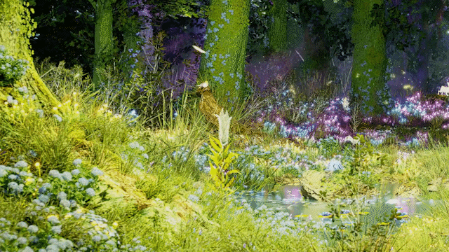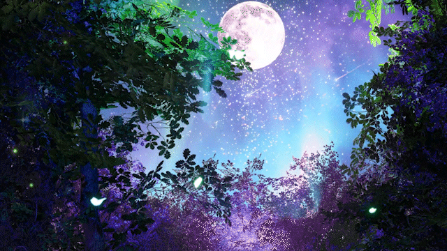 Two white deer race through a radiant forest of light, charging toward a fantastical moon.